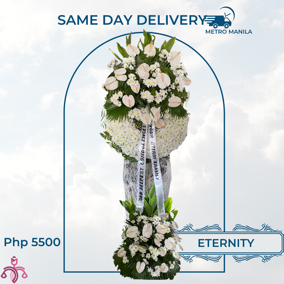 Eternity is a thoughtfully designed sympathy arrangement that honors cherished memories with understated elegance. Featuring a striking half-circle composition adorned with a graceful anthurium as its focal point, this arrangement conveys deep compassion and respect during difficult times. The minimalist design reflects the timeless nature of love and remembrance, making it an appropriate choice for memorial services, funerals, or to express heartfelt condolences. Perfect for those seeking a meaningful tribute that speaks volumes through its refined simplicity.