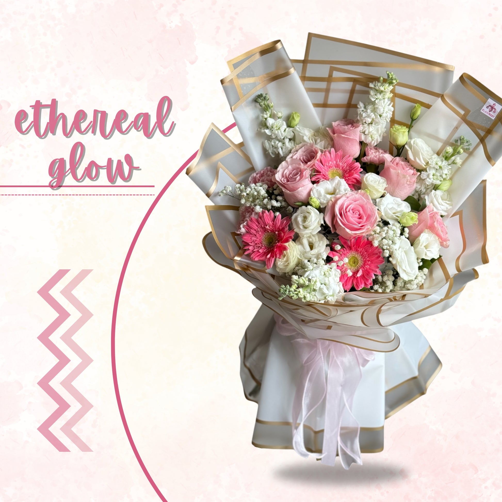 Ethereal Glow features a carefully curated selection of pink imported rose, Matthiola, Gerbera Pink, Lisianthus, carnations, and Gypsophila for a stunningly elegant and delicate arrangement. Adorned with white wrapping paper and a gold lining, this bouquet stands at 26 inches tall.
