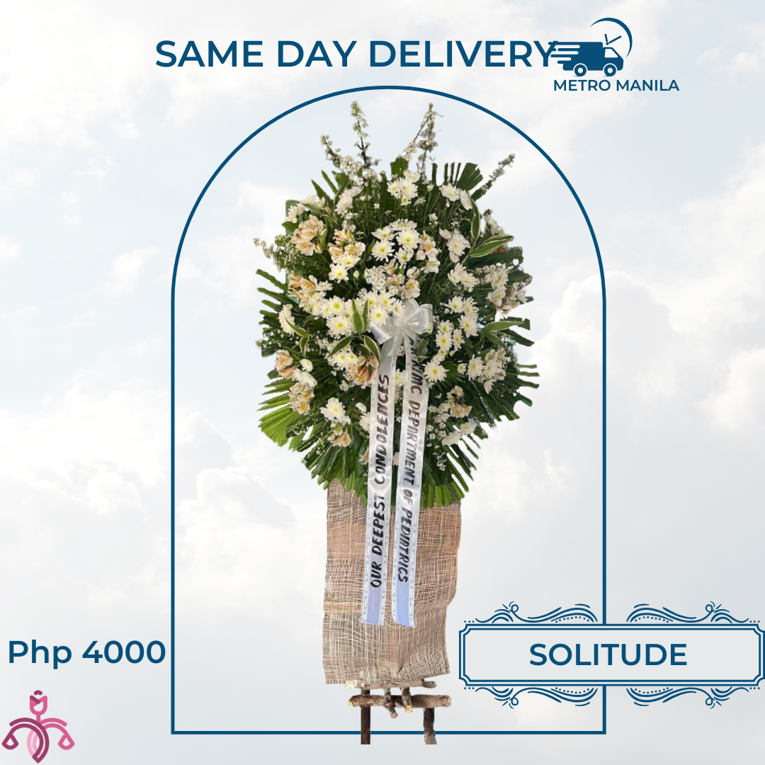 Solitude is a thoughtfully composed sympathy arrangement designed to convey compassion during difficult times. This elegant composition features premium roses as the focal point, complemented by delicate accent flowers that add depth and texture. The arrangement is finished with natural burlap accents, creating a warm, understated aesthetic that speaks to quiet remembrance. Perfect for expressing condolences with grace and sincerity.